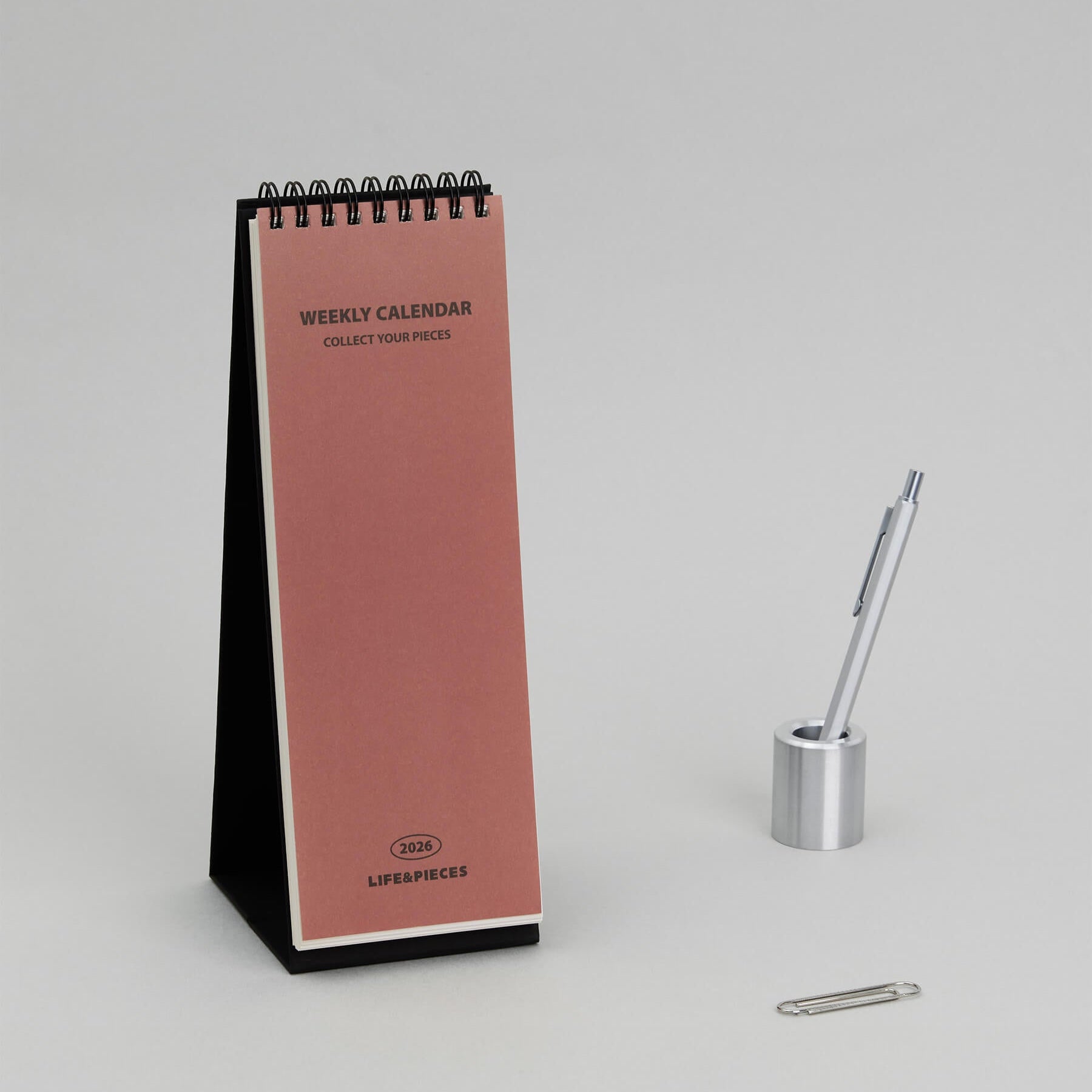 A dated 13-month weekly desk calendar running from December 2025 to December 2026. Designed with a slim vertical layout to maximize desk space while providing generous memo areas for efficient planning.