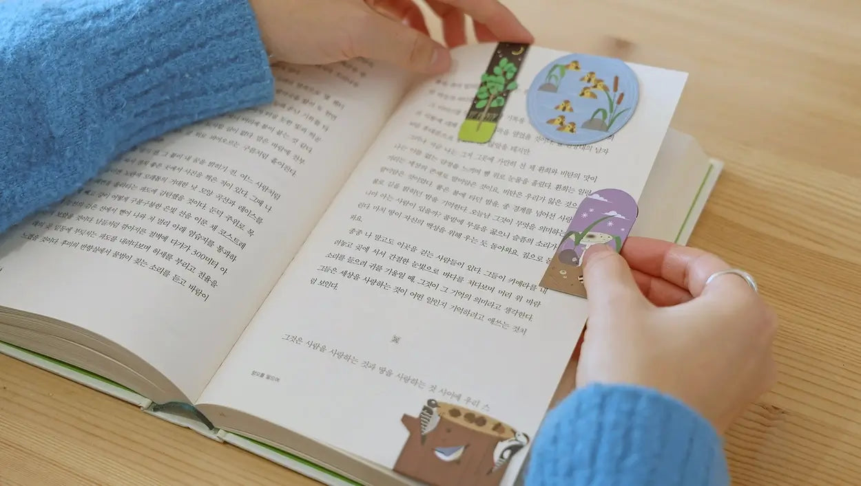 A magnetic bookmark that easily snaps onto your desired page. The thin internal magnets ensure a secure hold without damaging the paper, providing a sense of stability.
