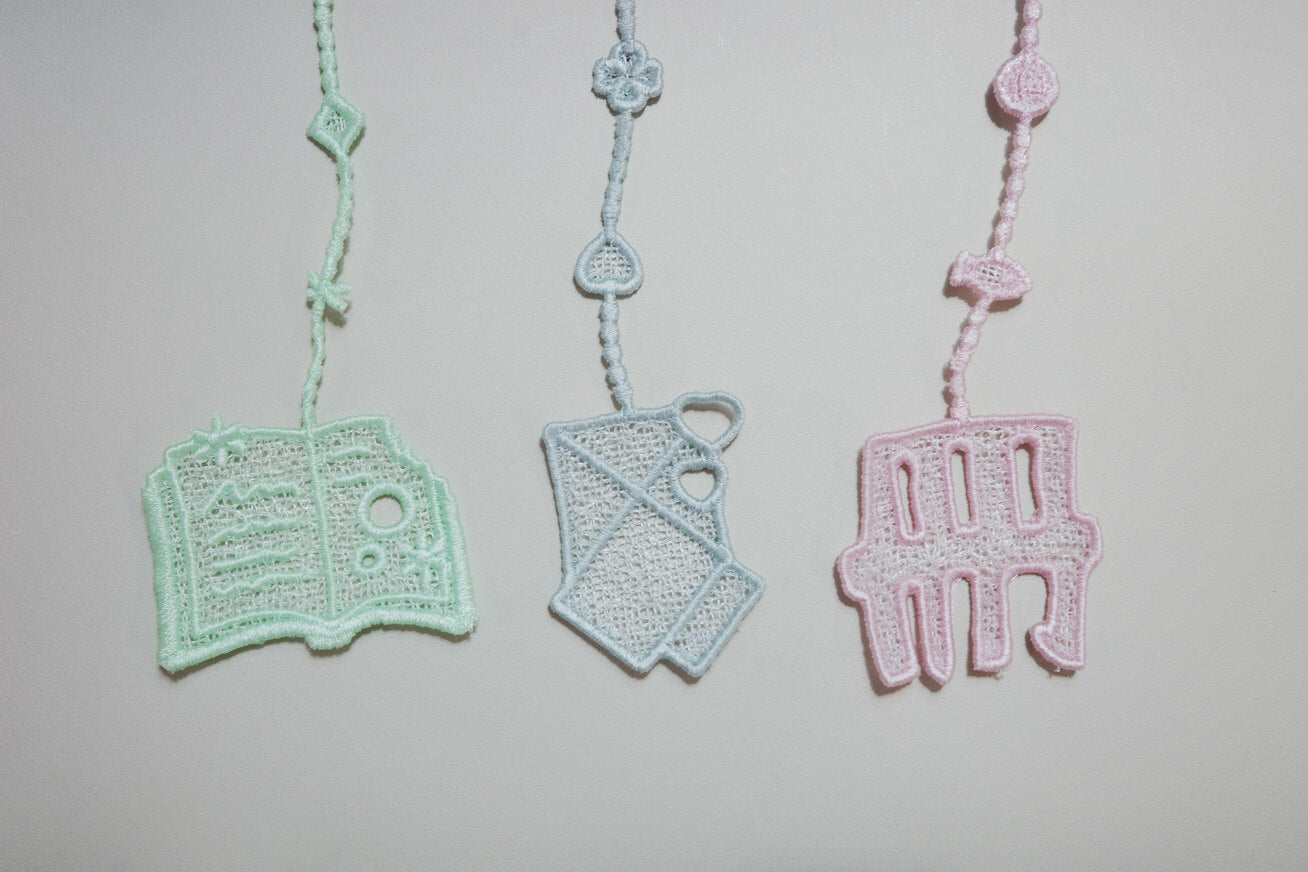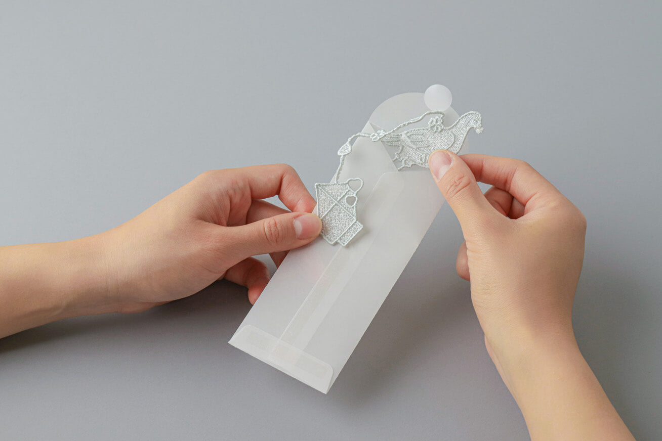 Using a sophisticated weaving technique without base fabric, this bookmark is crafted solely from intertwined threads. The soft luster of 100% rayon is gentle on your books, while the translucent packaging evokes the discovery of a library treasure. Simply place the holed book inside and let the bookworm mark your journey.