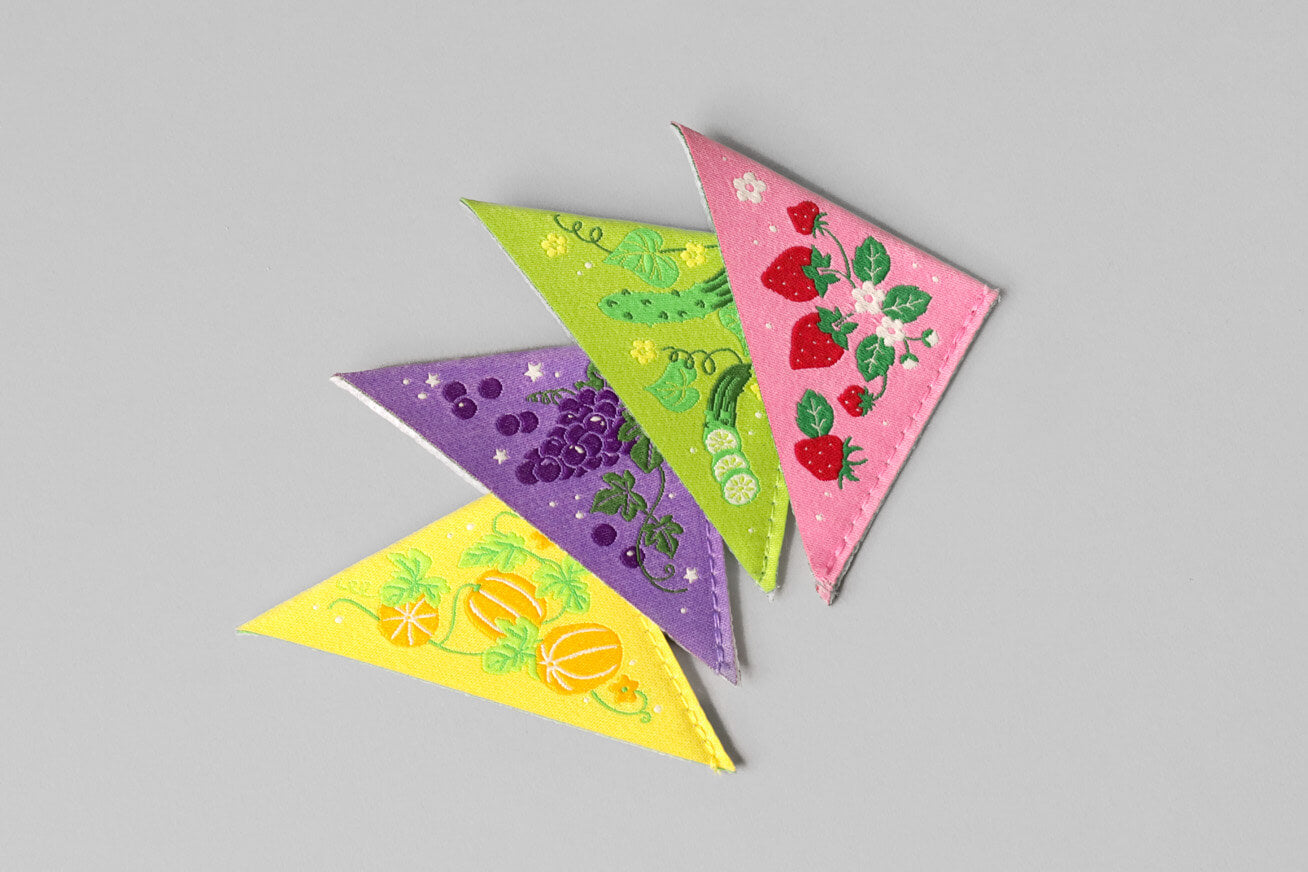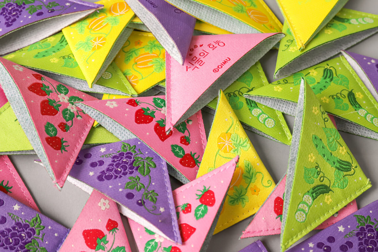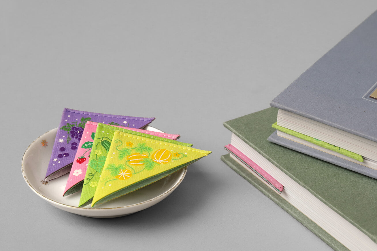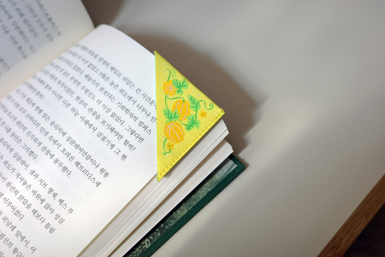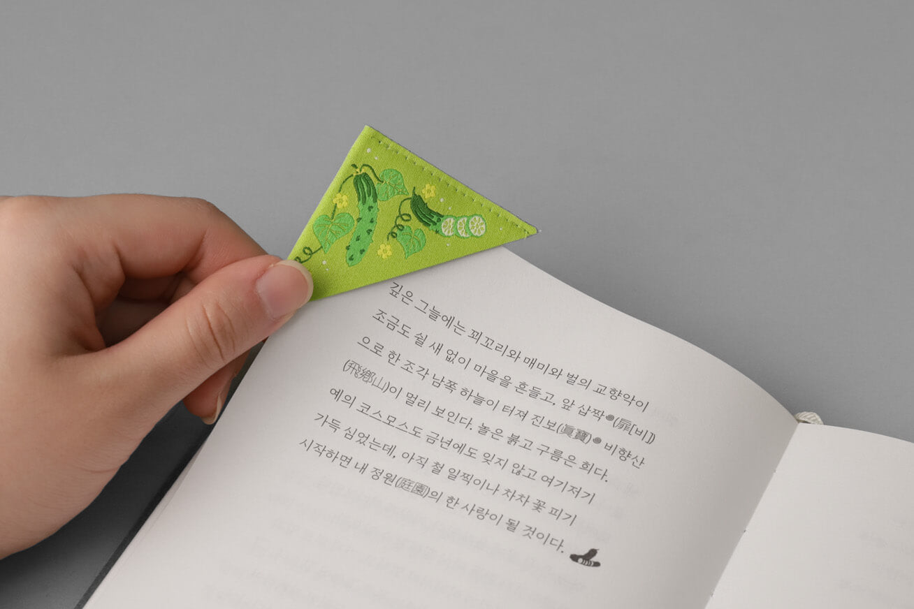 OIMU Woven Corner Bookmark A charming corner-style bookmark meticulously woven from colored threads. Designed to slip onto the edge of your page, it features vibrant motifs of seasonal Korean fruits inspired by the beauty of nature.