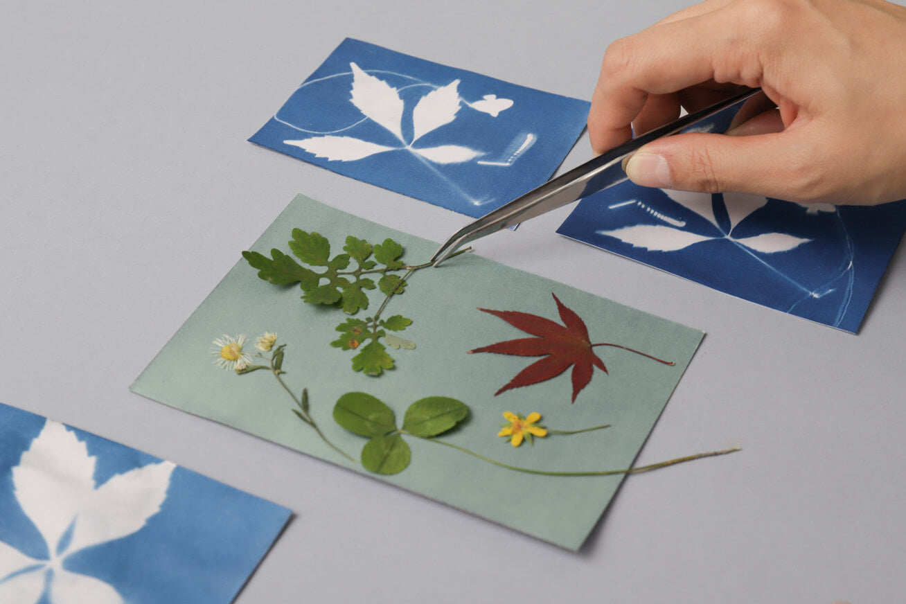 1. Arrange: Place botanical specimens or objects on the provided light-sensitive card.