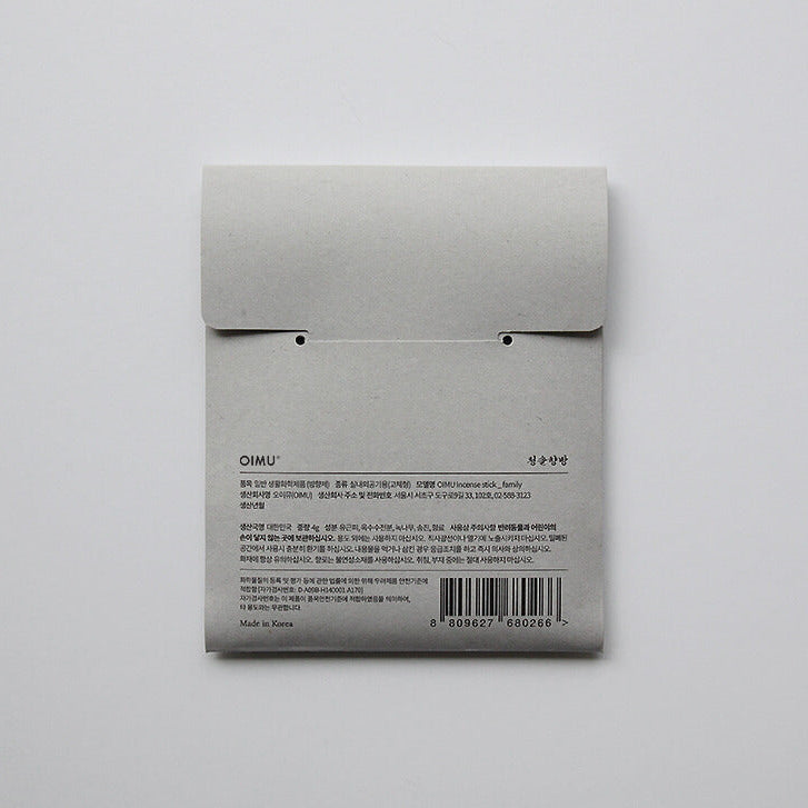 Incense Stick Family (4-Scent Sampler) The Incense Stick Family set is a curated collection that brings together all four signature scents: Sandalwood, Citrus Peel, Hazelnut, and Fig. This set is designed for those who wish to explore the diverse olfactory world of traditional Korean incense. Crafted in collaboration with a heritage incense workshop, these sticks are made using natural ingredients like elm bark and corn starch, offering a pure and calming breathing experience.