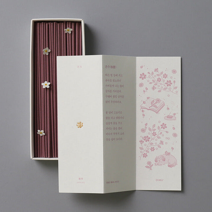 Seasonal Incense Stick Series Capture the fleeting beauty of the four seasons within your home. This collection is a poetic tribute to the changing landscape of Korea, crafted in collaboration with a heritage incense workshop. Using time-honored techniques and natural binders like Elm Bark and Corn Starch, these sticks offer a clean, gentle burn that transforms your atmosphere.