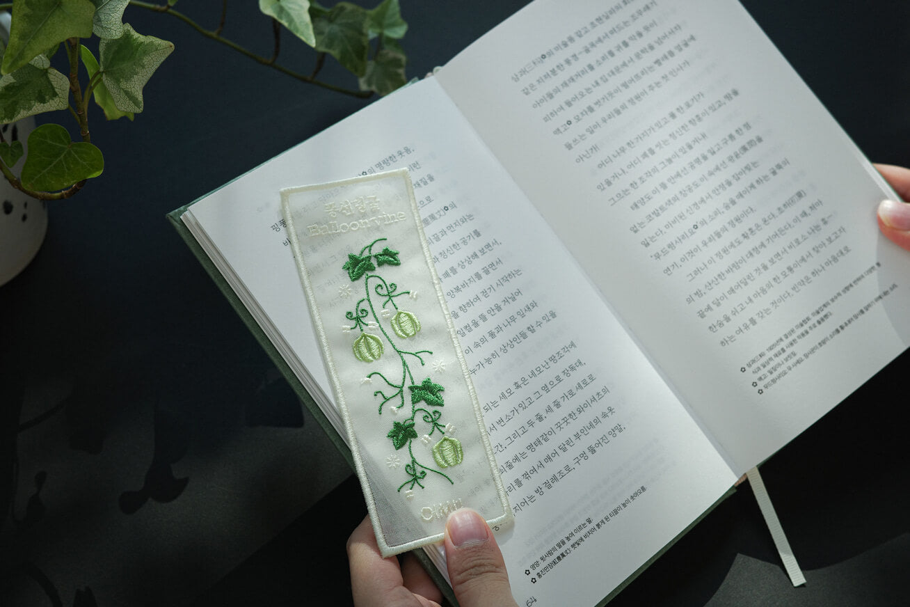 The bookmark is made from Nobang, a sheer and elegant fabric traditionally used in Korean Hanbok. By layering two sheets of Nobang and finishing all four edges, the bookmark maintains a slim profile that won't damage your book while providing a surprisingly durable and sturdy grip. The delicate embroidery captures the timeless spirit of nature.