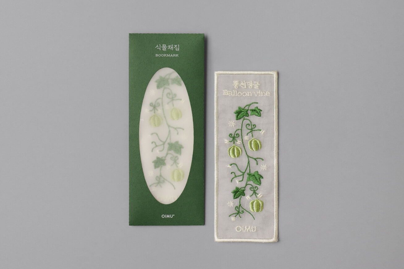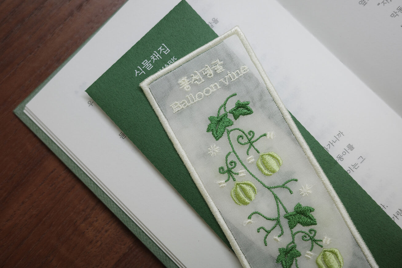 A botanical bookmark designed to capture and preserve a piece of nature. It features a delicate bookmark with fine botanical embroidery on traditional Korean Nobang fabric. This set allows you to enjoy the elegant embroidery or create a personalized keepsake by collecting your own plant specimens.