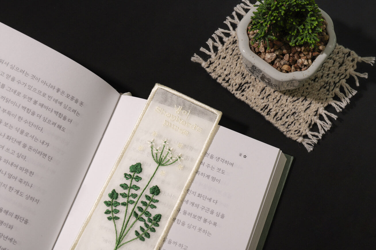 The bookmark is made from Nobang, a sheer and elegant fabric traditionally used in Korean Hanbok. By layering two sheets of Nobang and finishing all four edges, the bookmark maintains a slim profile that won't damage your book while providing a surprisingly durable and sturdy grip. The delicate embroidery captures the timeless spirit of nature.