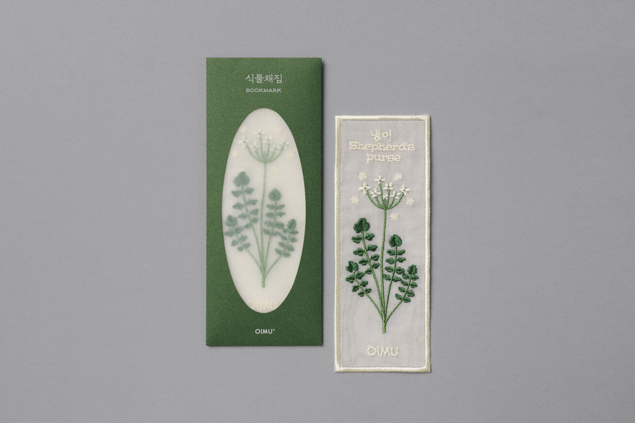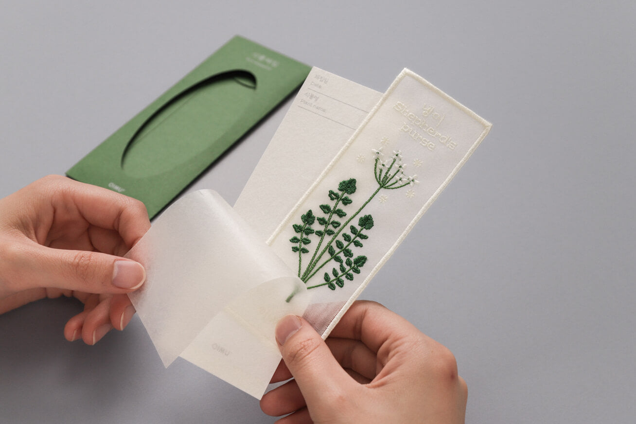 A botanical bookmark designed to capture and preserve a piece of nature. It features a delicate bookmark with fine botanical embroidery on traditional Korean Nobang fabric. This set allows you to enjoy the elegant embroidery or create a personalized keepsake by collecting your own plant specimens.
