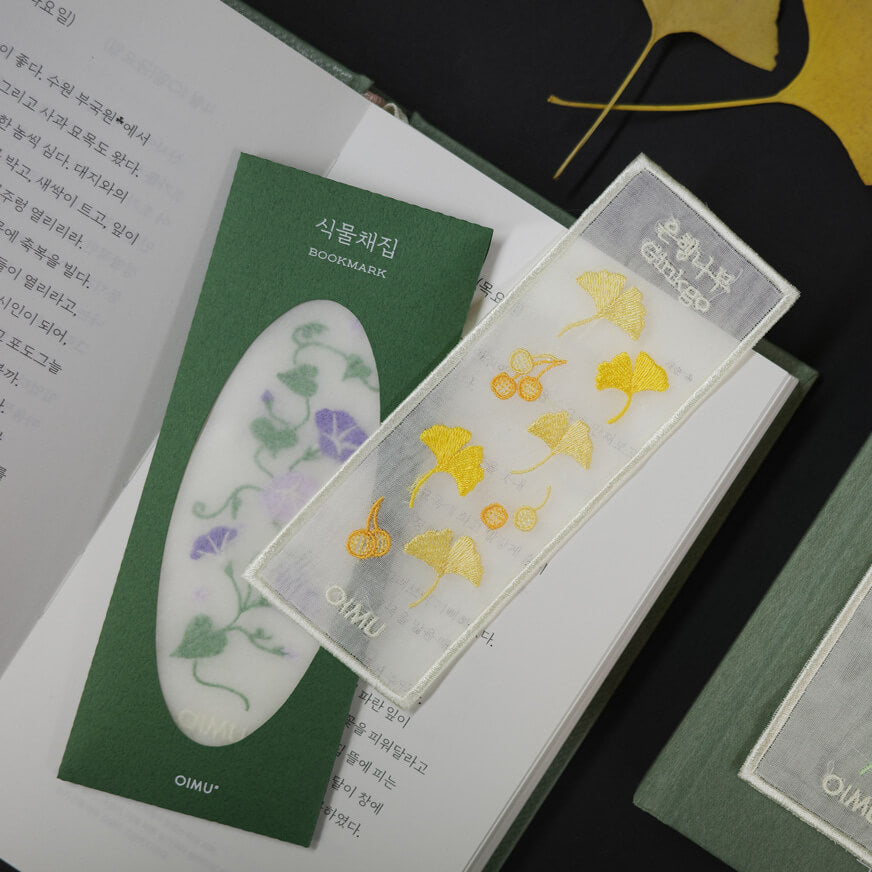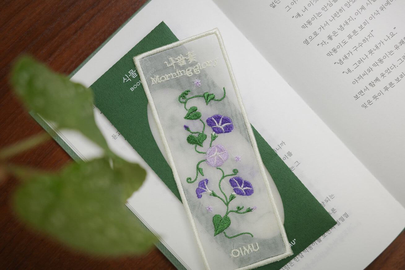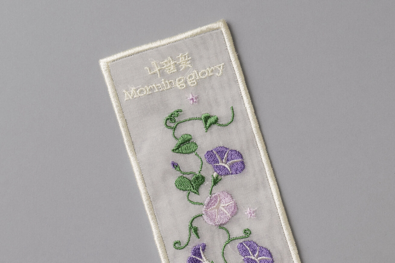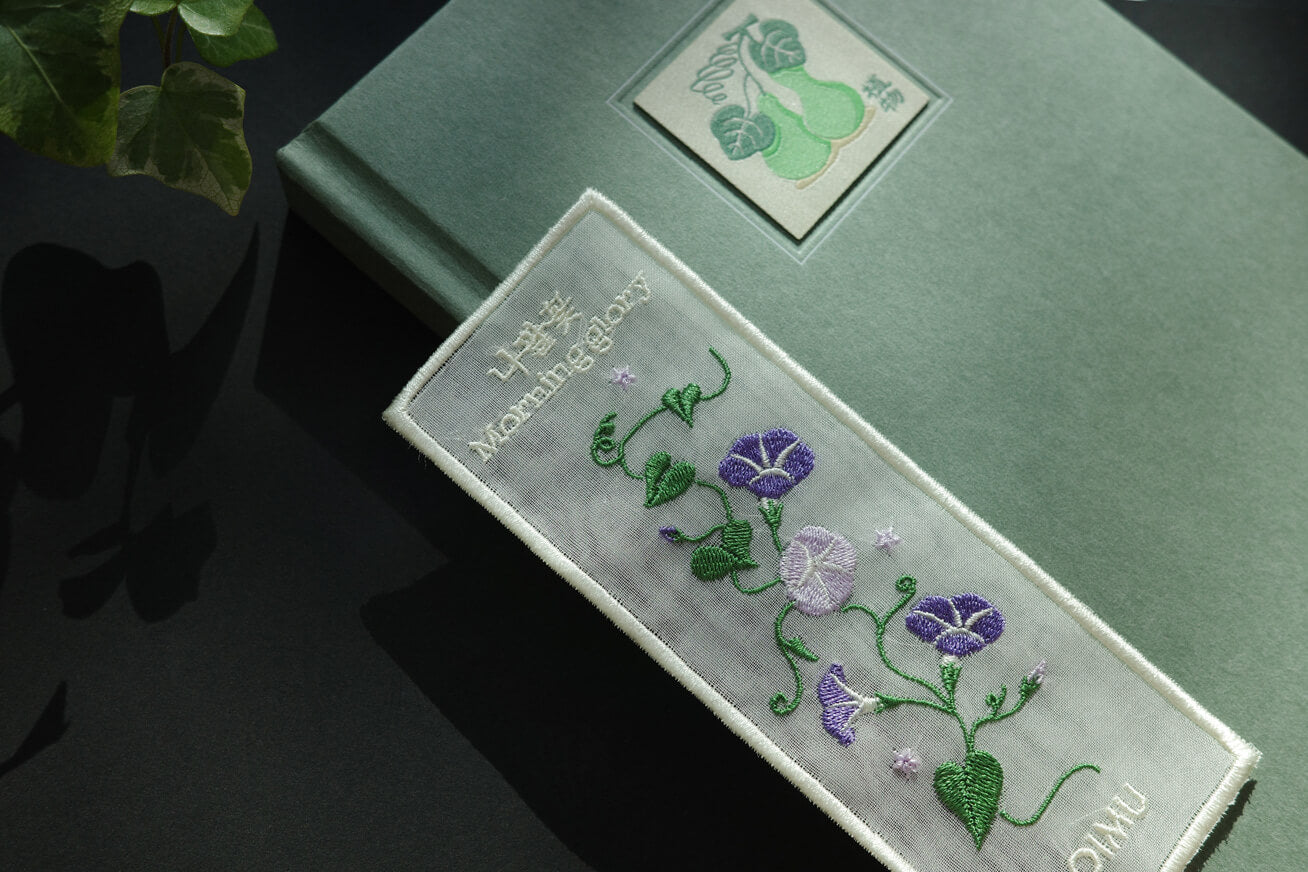 The bookmark is made from Nobang, a sheer and elegant fabric traditionally used in Korean Hanbok. By layering two sheets of Nobang and finishing all four edges, the bookmark maintains a slim profile that won't damage your book while providing a surprisingly durable and sturdy grip. The delicate embroidery captures the timeless spirit of nature.