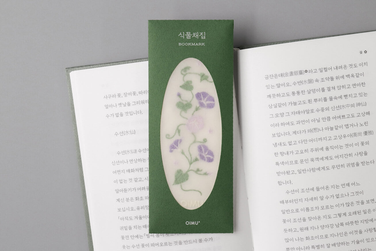 A botanical bookmark designed to capture and preserve a piece of nature. It features a delicate bookmark with fine botanical embroidery on traditional Korean Nobang fabric. This set allows you to enjoy the elegant embroidery or create a personalized keepsake by collecting your own plant specimens.