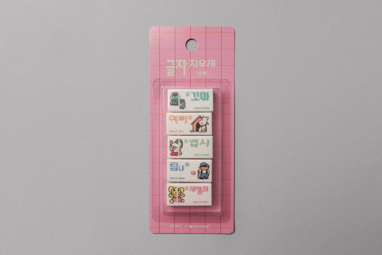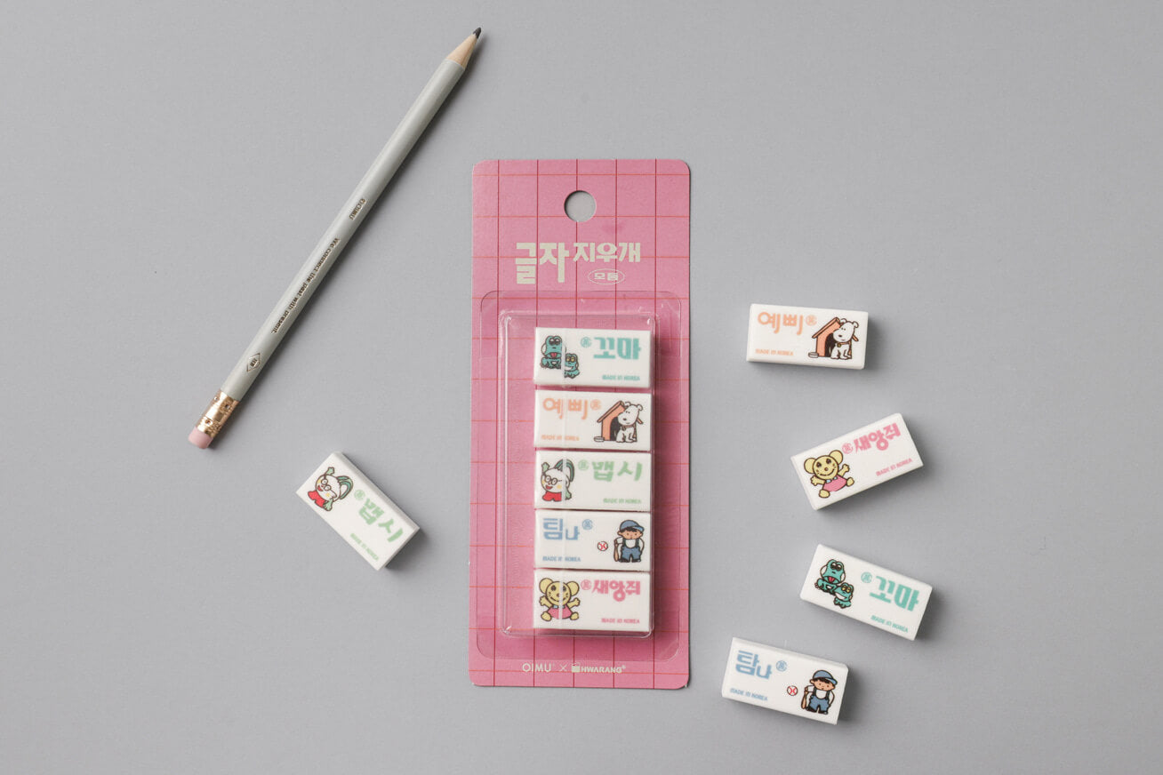 HWARANG x OIMU Letter Eraser Module This special collaboration reimagines the iconic product names of 'HWARANG'—Korea's first-generation eraser brand—through OIMU’s sophisticated typography. Featuring vintage names like 'Kkoma' and 'Yeppi,' these erasers offer a poetic touch to the act of erasing, turning a simple tool into a piece of cultural heritage.