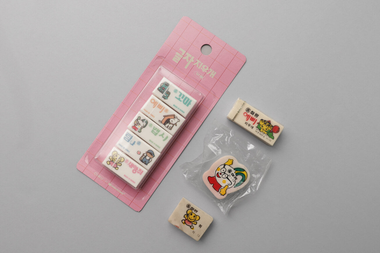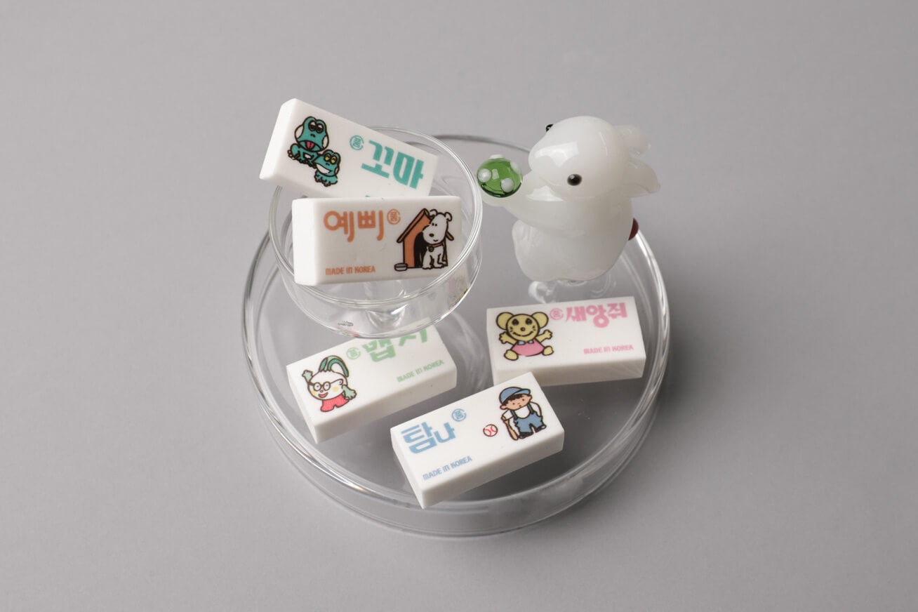 The Hangeul words printed on the sleeves—Kkoma (Little One), Yeppi (Pretty One), Maepsi (Stylish), Tamna (Desirable), and Saenang-jwi (Little Mouse)—are the actual product names used by HWARANG Erasers since 1950. These nostalgic and charming words have been part of Korean stationery history for decades. This module is not just an eraser; it is a way to own a piece of Korean design heritage.