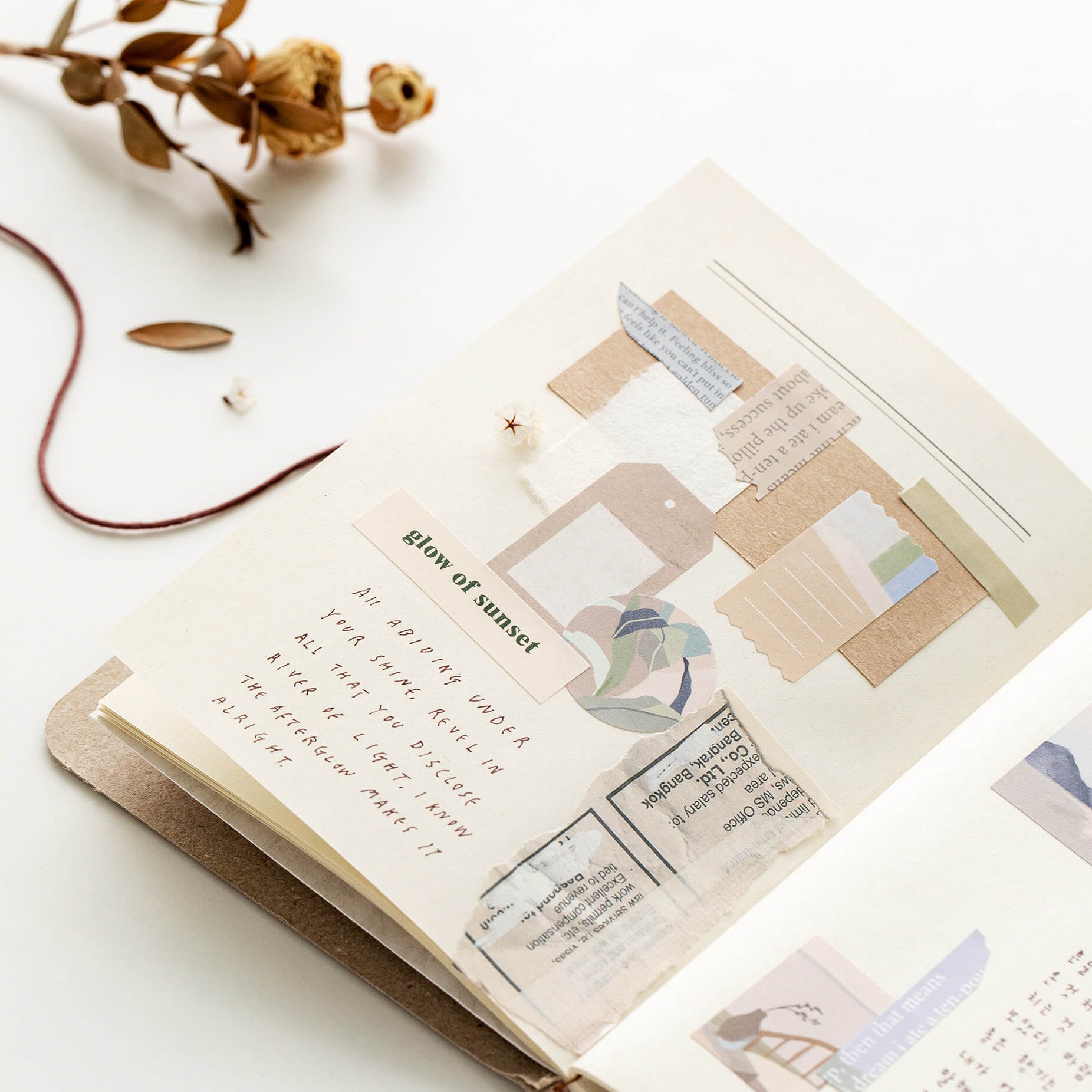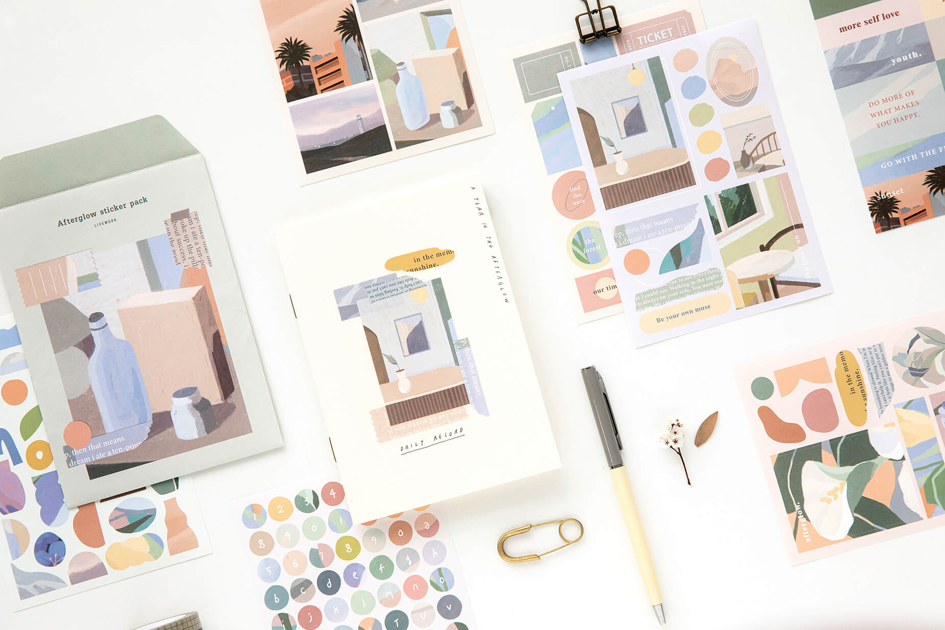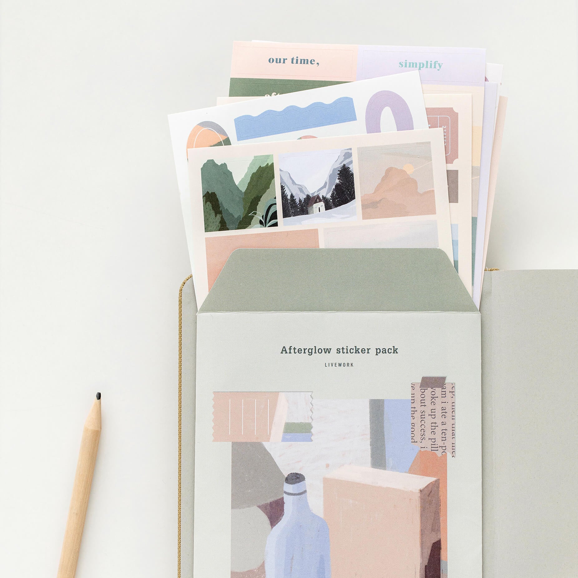 The Afterglow Sticker Pack features richly emotional, paper-based decorative stickers with warm, pastel-toned illustrations. They are highly recommended by customers for diary and planner customization.