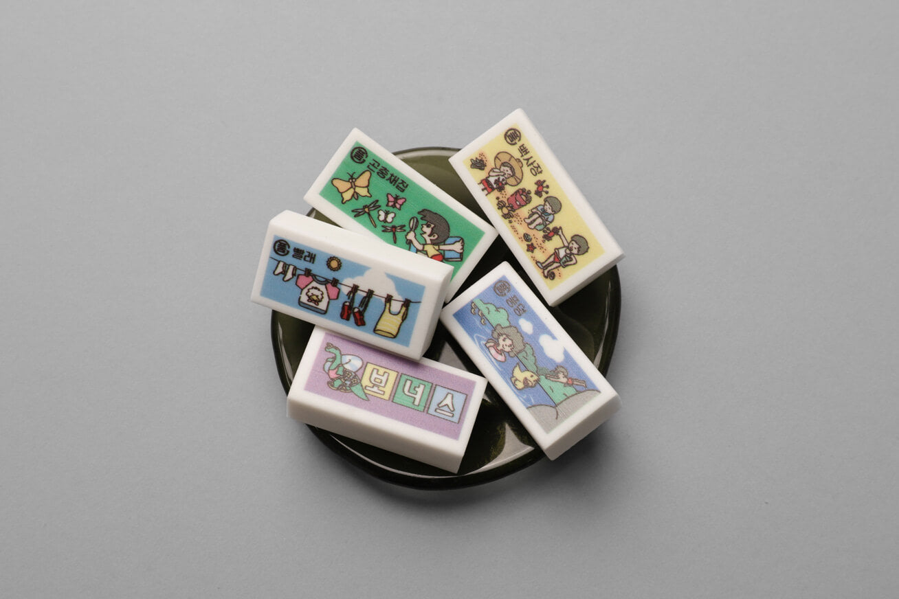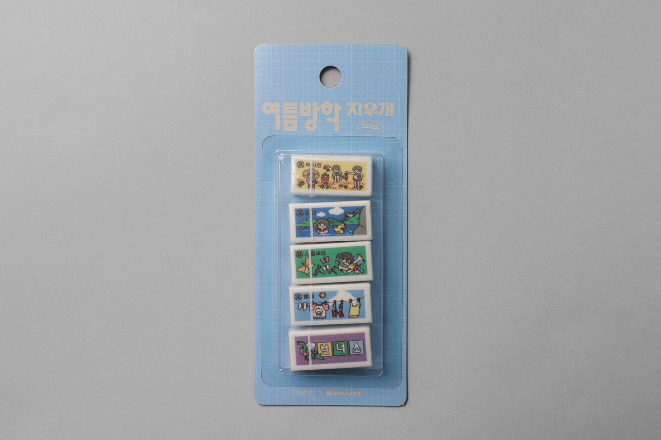 HWARANG x OIMU Summer Vacation Eraser Module A collaborative eraser set by HWARANG and OIMU that captures the vivid memories of a blue summer. Building upon the heritage of 'HWARANG,' Korea's first eraser brand, this module visualizes fragments of summer days—such as insect collecting, refreshing watermelons, and sudden rain showers—into a set of three beautifully colored erasers.